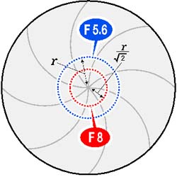 F¼ö¸¦ ÇÑ ´Ü°è ´Ã¸®¸é µÕ±×·± ·»Á ÅëÇØ µé¾î¿À´Â ºûÀÇ ¾çÀÌ ²À ¹ÝÀ¸·Î ÁÙ¾îµç´Ù. Ä«¸Þ¶óÀÇ Á¶¸®°³°¡ ·»Á Àû´çÈ÷ °¡·Á, ºûÀÌ µé¾î¿À´Â ºÎºÐÀÇ ¸éÀûÀÌ ¹ÝÀÌ µÇ°Ô ÇÑ´Ù´Â ¼Ò¸®´Ù. ±×·±µ¥ ¿øÀÇ ³ÐÀÌ´Â (¥ð¡¿¹ÝÁö¸§ÀÇ Á¦°ö)À̹ǷÎ, ³ÐÀ̰¡ Àý¹ÝÀÌ µÇ·Á¸é ¹ÝÁö¸§Àº ¡î2(¾à 1.4)·Î ³ª´« °Í¸¸Å ÁÙ¾î¾ß ÇÑ´Ù.