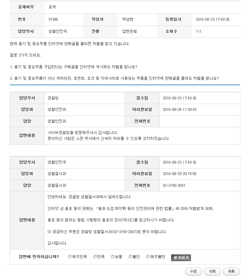 Á¤ºÎ ºÎó¿¡ ÁúÀǸ¦ Çϸé ÁúÀÇ ÀÚ°¡ ¿ä±¸ÇÏ´Â ¸íÈ®ÇÑ ´äº¯À» ²À Âó¾î¼ ÇØ ÁÖÁö ¾Ê°í ¹ý Á¶Ç× µîÀ» ¼³¸íÇϵíÀÌ ´äº¯À» ÇÏ¿© ÁúÀÇ ÀÚ°¡ ¿øÇÏ´Â ´äº¯À» ¹Þ±â°¡ ¾î·Á¿îµ¥ À§ ÁúÀÇ, ´äº¯ ³»¿ëµµ ÁúÀÇ´Â ±¸¸ÅÇÏ¿´À» °æ¿ì À§¹ý¿©ºÎ¸¦ ¹¯´Âµ¥ ´äº¯Àº ÆÇ¸Å¸¦ ÇÏ¿´À» °æ¿ì ó¹ú ³»¿ëÀ» ´äº¯À¸·Î º¸³» ÁذÍÀ¸·Î ÆÇ´ÜµË´Ï´Ù.