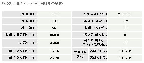 >F-15K´Â Áß, Àú°íµµ, ÁÖ ¾ß°£, ȤÀº ¾ÇõÈĽÃÀÇ Á¤¹Ð Ÿ°Ý ÀÓ¹«¿¡¼ ¼±ÅÃÇÏ´Â ¹Ì °ø±ºÀÇ F-15E¸¦ ±â¹ÝÀ¸·Î ÇÕ´Ï´Ù. F-15E´Â ÃÖ´ë 23,000ÆÄ¿îµåÀÇ Å¾Àç·®À» ÀÚ¶ûÇϰí ÀÖÀ¸¸ç, Àå°Å¸® ¹× Á¤¹Ð Ÿ°Ý ÀÓ¹«¸¦ ¼öÇàÇÒ ¼ö ÀÖ´Â, ¹Ì±¹ÀÌ »ý»êÇÏ´Â À¯ÀÏÇÑ ÀüÅõ±âÀÔ´Ï´Ù. ¶ÇÇÑ F-15CÀÇ ¿Ïº®ÇÑ °ø´ë°ø ¼º´ÉÀ» º¸À¯Çϰí ÀÖ½À´Ï´Ù. ½ÇÁ¦·Î F-15 ±âÁ¾Àº 101ȸ ½Â¸®ÀÇ ÀüÅõ ±â·ÏÀ» º¸À¯Çϰí ÀÖÀ¸¸ç ÀÌ´Â ¼¼°è ÃÖ°íÀÇ ÀüÅõ±â ±â·ÏÀÔ´Ï´Ù.